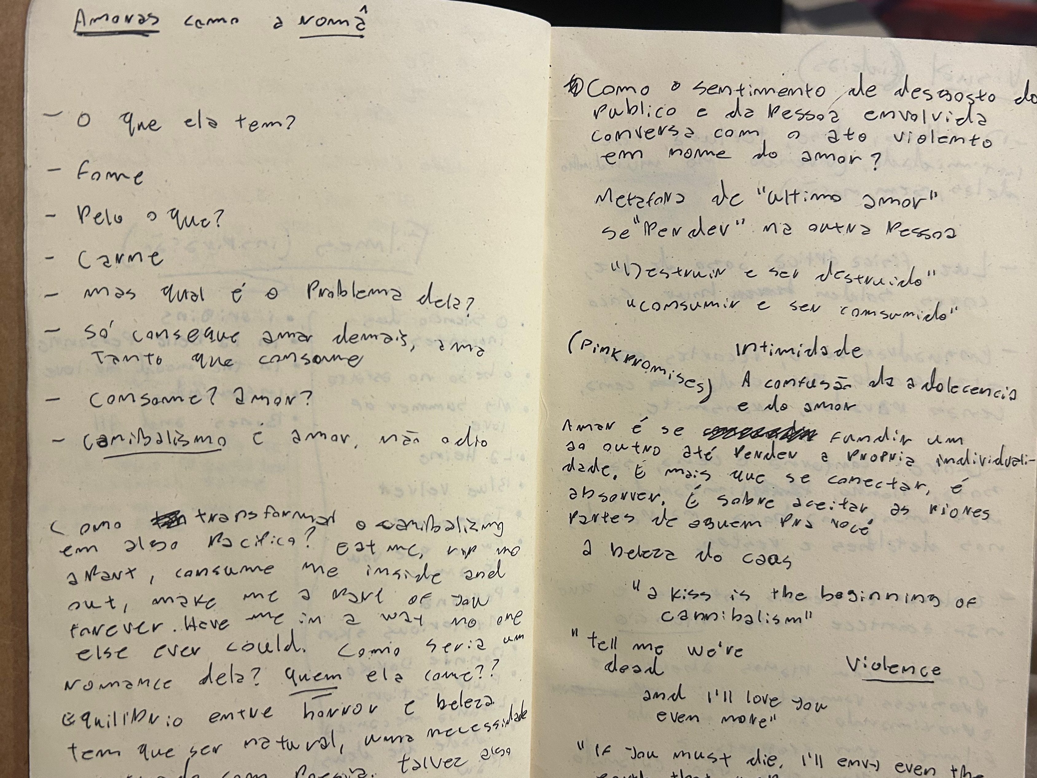 Envolver outra pessoa no roteiro é algo que é muito bom pra mim por me manter focada e trazer ideias e pontos de vista diferentes, por isso a ideia inicial surgiu de uma conversa com ele. A ideia da história por ser sobre antropofagia traz um desafio e uma certa falta de confiança pra mim, mas me mantenho focada pra usar isso de motivação, como um desafio de abordar um tema polêmico e ruim com delicadeza e coitado para construir um trabalho bem feito, diferente e impactante.