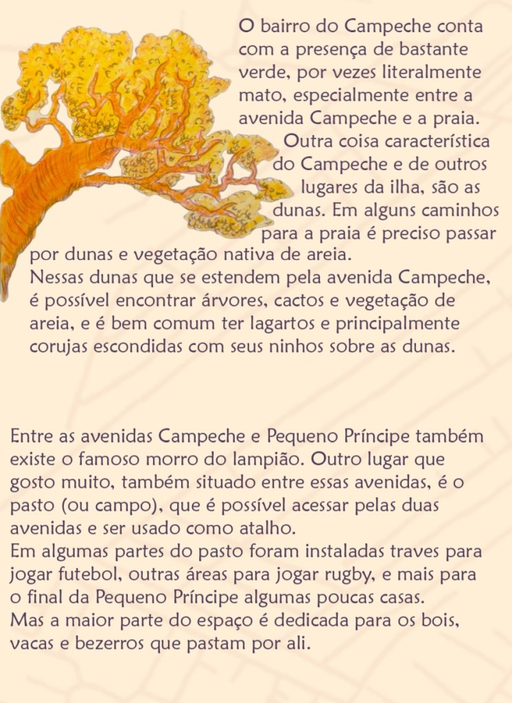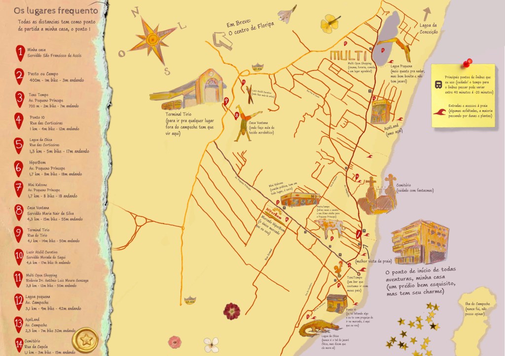 A ideia era simples, ter um mapa da minha região, buscando não ser um mapa turístico, mas um mapa pessoal. Com lugares presentes na minha rotina e informações relevantes para o meu dia a dia. No verso do mapa teria textos contando curiosidades sobre meu bairro, algumas histórias, dados e textos sobre a flora e fauna e animais do bairro.