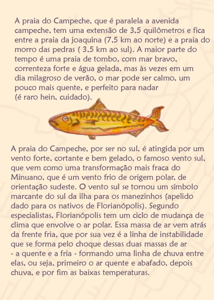 Sempre ando pelo bairro ou de bicicleta ou a pé, então estou sempre reparando em vários detalhes e lugares que agora foram úteis. Com alguns passeios focados em anotar e tirar fotos do meu bairro, consegui um material suficiente para iniciar minhas pesquisas online, que ocorreram através de sites de turismo, artigos de ciência sobre meu bairro, e sites específicos sobre surf que ajudaram com o conteúdo sobre vendo e mar.